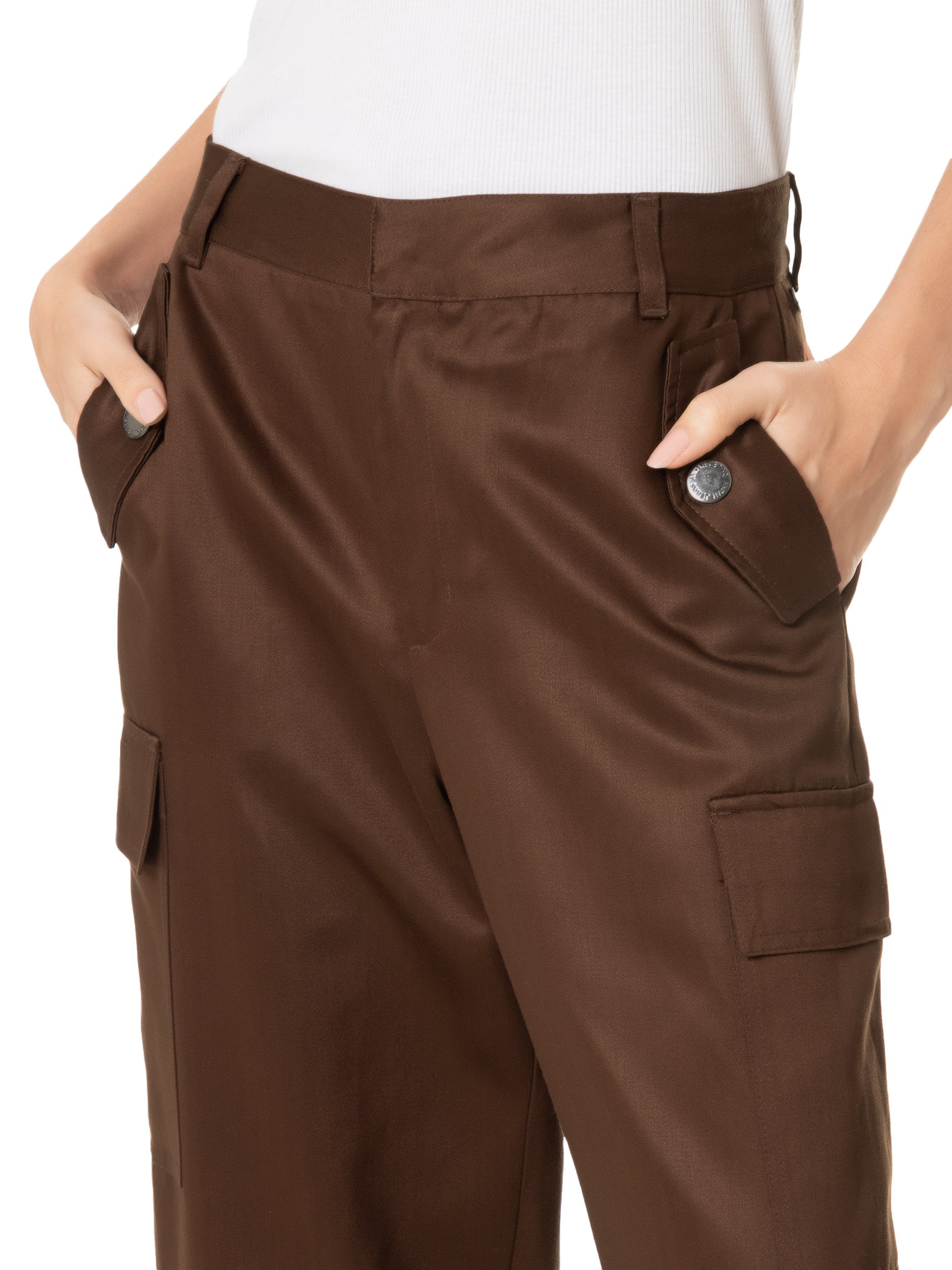 A calça marrom é confeccionada em tecido leve com toque de linho sem elasticidade. A peça solta ao corpo possui cintura alta, cós com passantes, recortes posteriores e frontais, bolsos posteriores, bolsos frontais modelo faca com vista sobreposta com botão aplicado, bolsos laterais modelo cargo, martingales aplicados na parte posterior na altura das barras, comprimento longo e fechamento frontal por colchetes, botão e zíper.