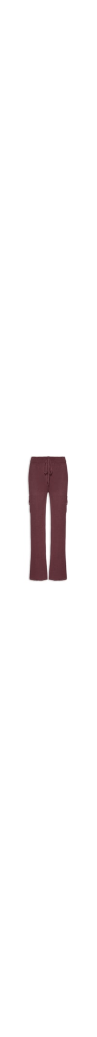A calça vermelha é confeccionada em tricot média elasticidade. A peça solta ao corpo possui cintura alta, cós com elástico embutido e cordão para ajuste frontal, bolsos embutidos nas laterais com lapela sobreposta e comprimento longo.