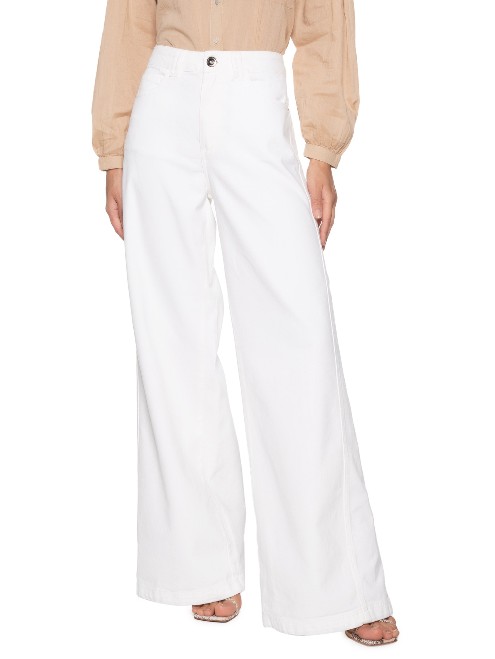 A calça branca é confeccionada em sarja sem elasticidade. A peça solta ao corpo de modelo pantalona possui cintura alta, cós com passantes aplicados, five pockets*, rebites metalizados aplicados nos bolsos frontais, recortes na parte lateral, comprimento longo e fechamento frontal por botão e zíper.