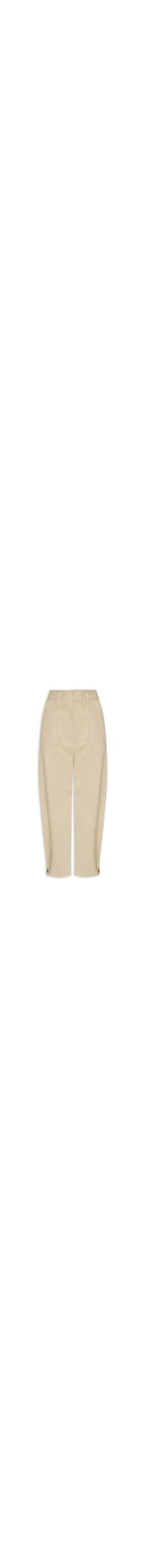 A calça bege é confeccionada em sarja sem elasticidade. A peça solta ao corpo possui cintura alta, cós com passantes aplicados, bolsos frontais de modelo faca, pregas frontais, bolsos posteriores com fechamento por abas sobrepostas e botões, pregas com fechamento por botões nas barras, comprimento cropped* e fechamento frontal por zíper e botão.