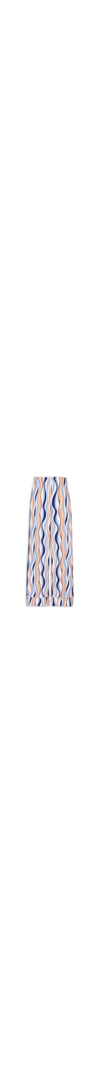A calça azul é confeccionada em crepe sem elasticidade. A peça solta ao corpo possui cós com elástico embutido na parte posterior, bolso posterior, bolsos frontais embutidos, estampa de linhas onduladas com cores contrastantes, recortes na altura das barras, comprimento longo e fechamento frontal por colchetes e zíper.
