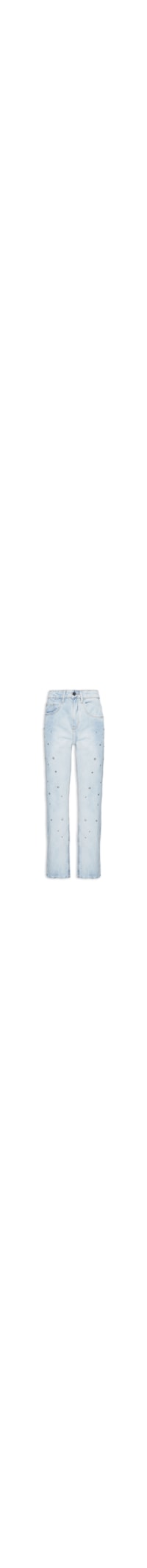 a calça Azul é Confeccionada Em sarja Com Lavagem Jeans Sem Elasticidade. A Peça Solta Ao Corpo, Possui Cintura Alta, Cós Com Passantes Aplicados, Five Pockets* Com Rebites Aplicados, Detalhes Destroyed** Nos Bolsos E Cós, Strass Aplicados Na Parte Fontal Em Tamanhos Variados, Tag Metálica Da Marca Aplicada No Bolso Posterior, Comprimento Longo, Acabamento Por Corte A Fio E Fechamento Frontal Por Zíper E Botão Metálico.