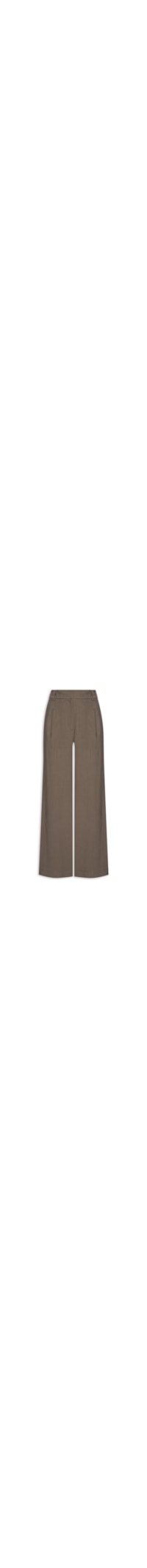 A calça marrom é confeccionada em tecido leve com baixa elasticidade. A peça solta ao corpo possui cintura alta, cós com passantes duplos, bolsos frontais embutidos, bolsos posteriores, recortes posteriores e frontais, comprimento longo e fechamento frontal por colchetes e zíper.
