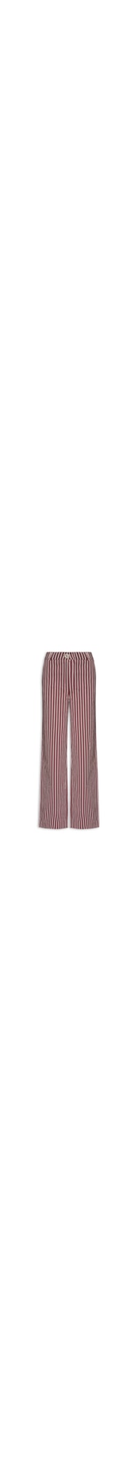 A calça vermelha é confeccionada em malha de algodão com leve elasticidade. A peça possui modelagem de alfaiataria reta, cintura alta, cós com passantes aplicados, bolsos frontais e posteriores com lapela, padronagem listrada em tom contrastante e fechamento frontal por zíper e botão.