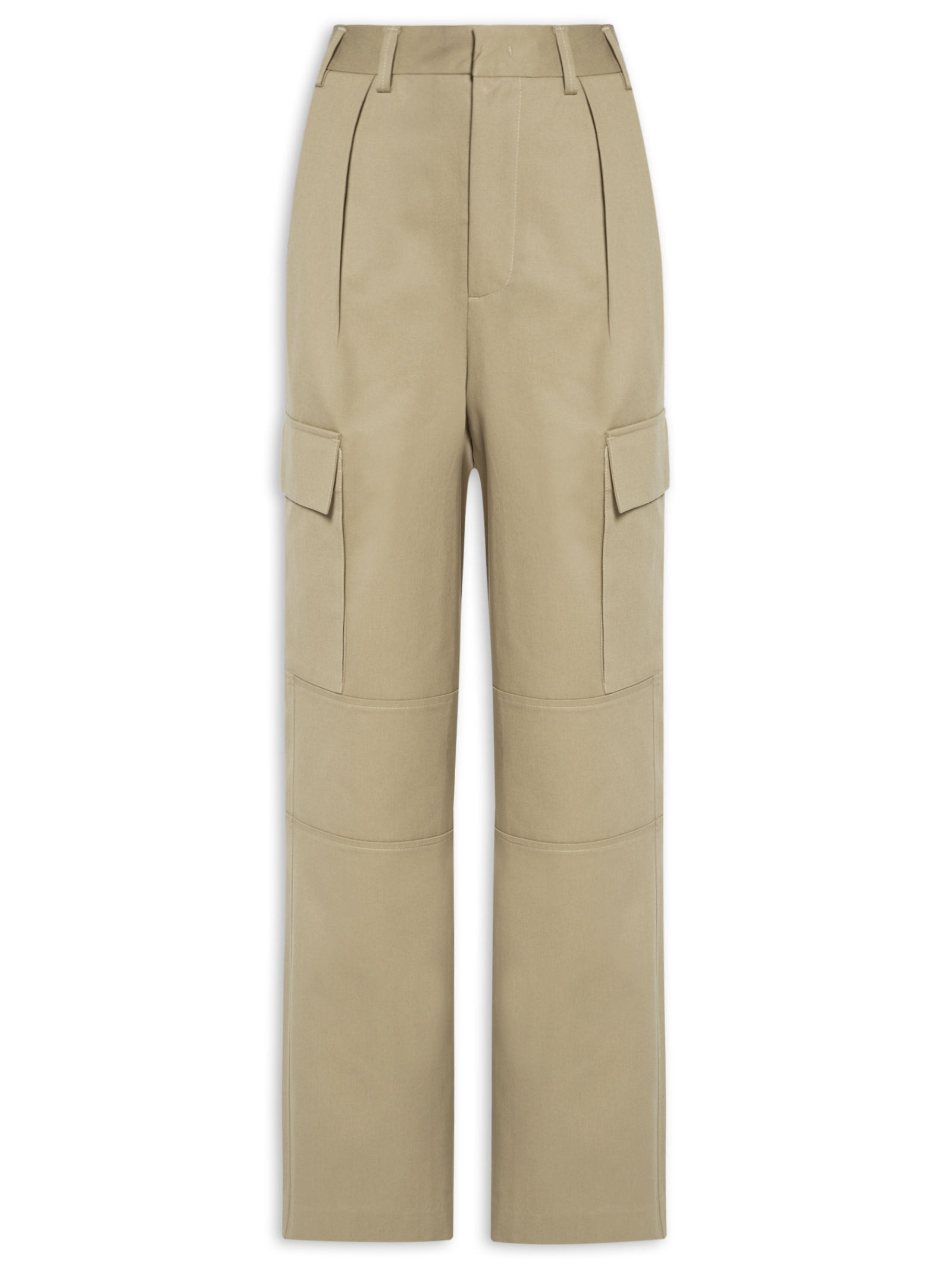 A calça bege é confeccionada em sarja leve sem elasticidade. A peça solta ao corpo possui cintura alta, cós com passantes aplicados, bolsos frontais de modelo faca, pregas frontais, pences posteriores, bolsos posteriores, recortes no comprimento com detalhe de pespontos, comprimento longo e fechamento frontal por zíper e colchete.