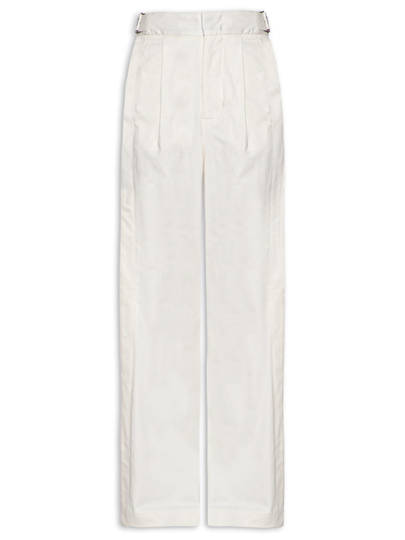A calça branca é confeccionada em sarja sem elasticidade. A peça solta ao corpo possui cós com fivelas laterais e tiras laterais sobrepostas na parte posterior para ajuste, cintura alta, pences frontais, bolsos frontais embutidos, recortes frontais e posteriores, dois bolsos posteriores sendo um deles decorativo e o outro embutido, comprimento longo e fechamento frontal por botão interno, colchetes e zíper.