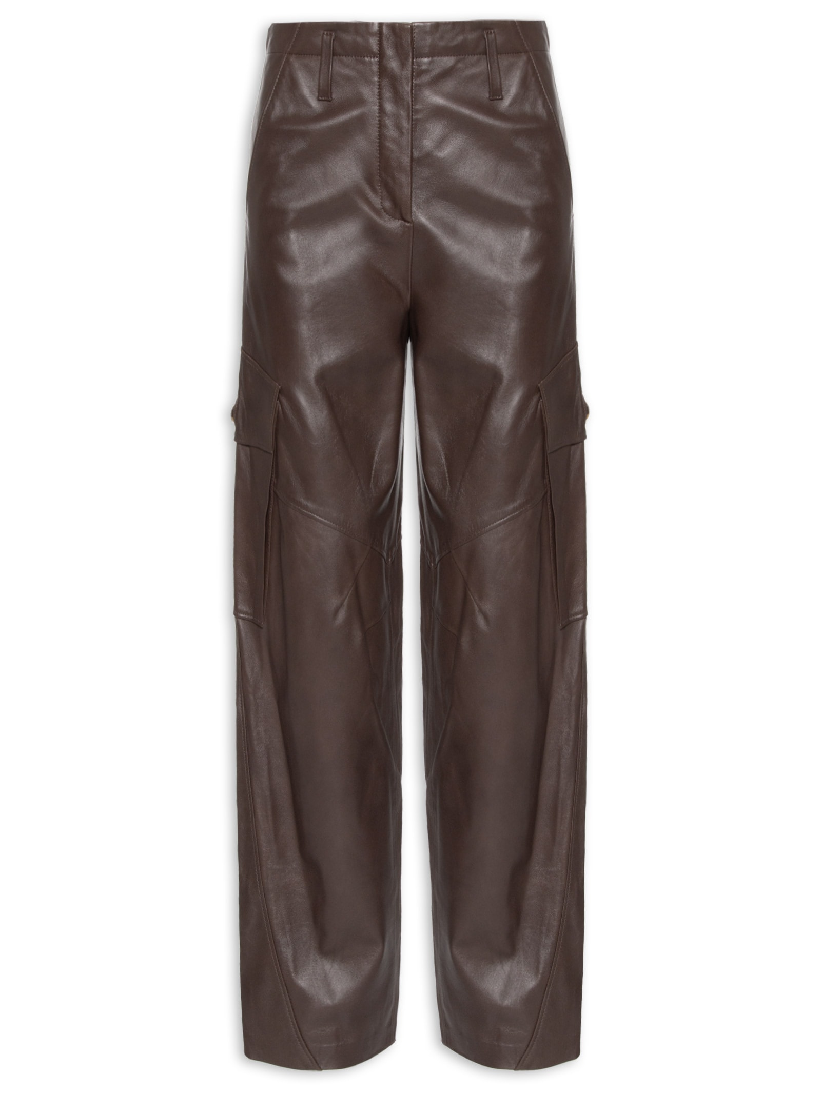 A calça marrom é confeccionada em couro sem elasticidade. A peça solta ao corpo modelo cargo possui cós com passantes, cintura alta, bolsos frontais modelo faca, recortes frontais e posteriores, bolsos laterais com abas sobrepostas e fechamento por botão, comprimento longo e fechamento frontal por botão de pressão e zíper.