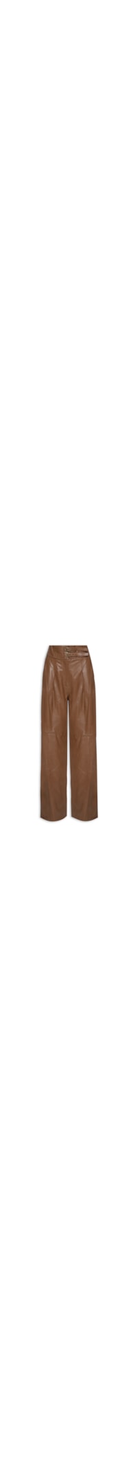 A calça marrom é confeccionada por couro com baixa elasticidade. A peça de modelo pantalona é solta ao corpo possui cintura alta, cós com detalhes em recorte e fivelas, pences frontais, bolsos frontais no modelo faca, recortes frontal e posterior no comprimento, fechamento em zíper e fivela frontal e comprimento longo.