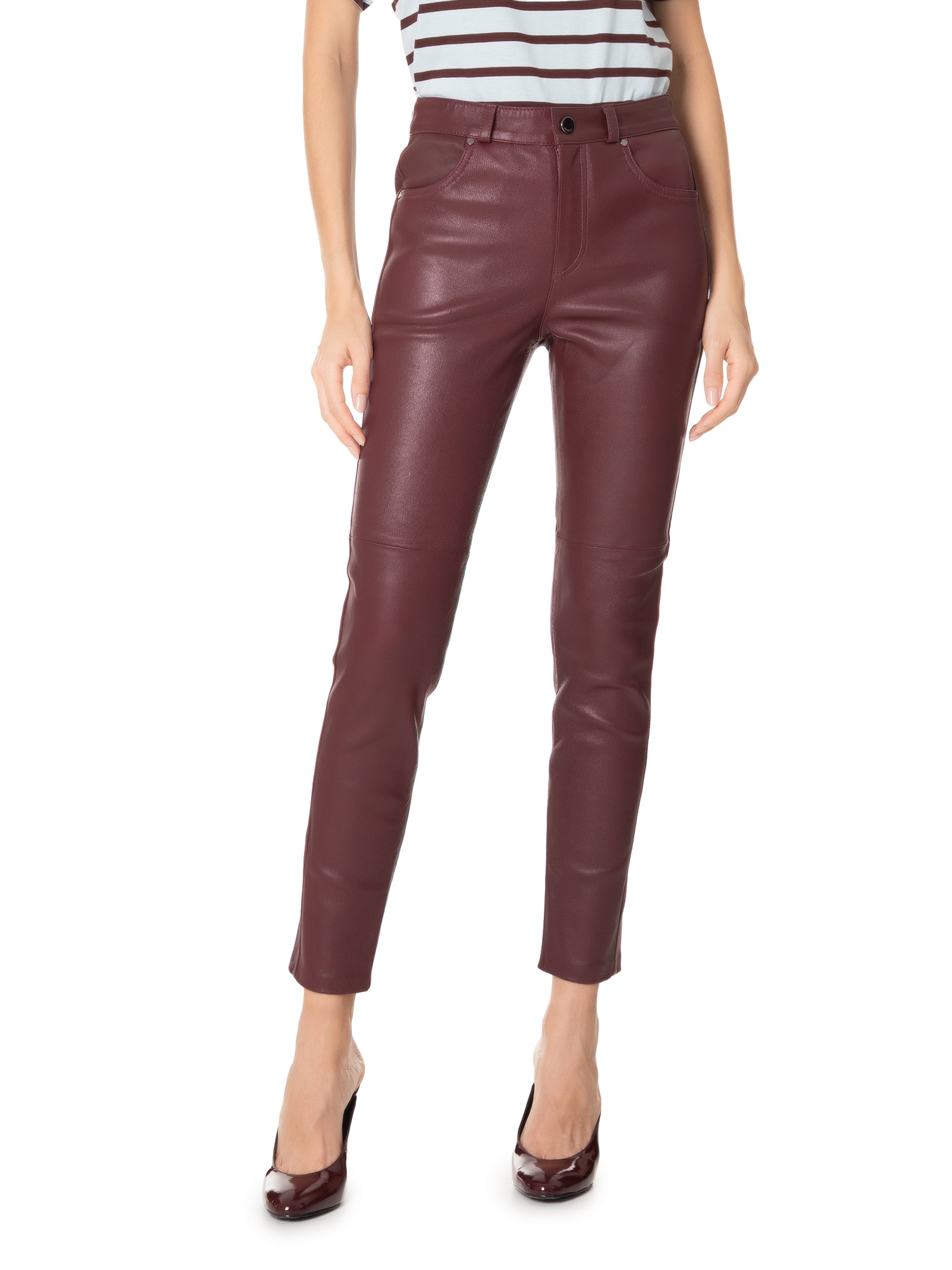 A calça vinho é confeccionada em couro. A peça justa ao corpo possui cintura alta, cós com passantes aplicados, bolsos frontais de modelo faca, recortes frontais e posteriores, bolsos posteriores, comprimento cropped* e fechamento frontal por zíper e botão.