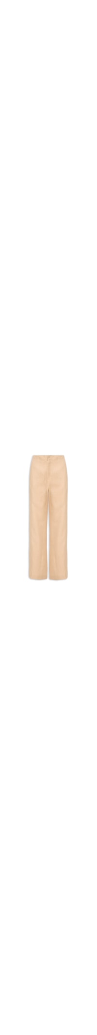 A calça bege é confeccionada em linho sem elasticidade. A peça solta ao corpo possui cintura alta, pences posteriores, bolsos posteriores decorativos, pregas frontais, bolsos frontais embutidos, comprimento longo e fechamento frontal por botão, colchetes e zíper.