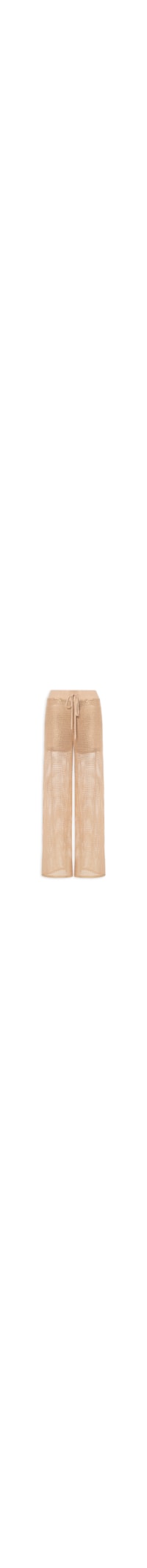 A calça dourada é confeccionada em tricot com superfície em foil de média elasticidade. A peça solta ao corpo, possui cintura alta, cós canelado com elástico e cordão embutido para amarração frontal, trama aberta com transparência, comprimento longo e forro curto.