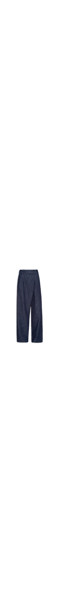 A calça azul é confeccionada em sarja com lavagem jeans e sem elasticidade. A peça solta ao corpo possui cintura alta, cós com passantes e elástico embutido na parte posterior, bolsos frontais embutidos, recorte posterior, recorte frontal assimétrico, bolsos posteriores e comprimento longo.