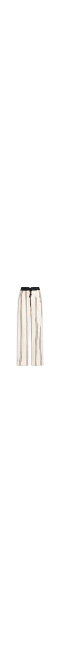 A calça bege é confeccionada em tecido leve com toque de linho e sem elasticidade. A peça solta ao corpo possui cós com ilhoses aplicados para ajuste por amarração e elástico embutido aplicado na parte posterior, cintura alta, bolsos frontais embutidos, padronagem de listras em cores contrastantes, comprimento longo e fechamento frontal por botões internos e zíper.