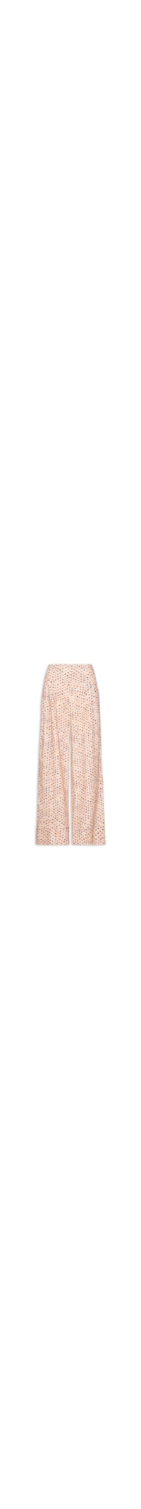 A calça bege é confeccionado tecido leve com toque de linho e sem elasticidade. A peça solta ao corpo possui cintura alta, cós amplo, bolsos frontais modelo faca, recortes frontais e posteriores, bolsos posteriores, pregas frontais, padronagem étnica em cores contrastantes, forro, comprimento longo e fechamento frontal por colchete e zíper.