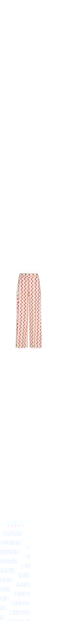A calça vermelha é confeccionada em tecido leve com toque de linho sem elasticidade. A peça solta ao corpo possui cintura alta, bolsos frontais embutidos, tira fina na parte posterior, pences posteriores, estampa abstrata com fundo bege, comprimento longo e fechamento frontal por colchetes e zíper.
