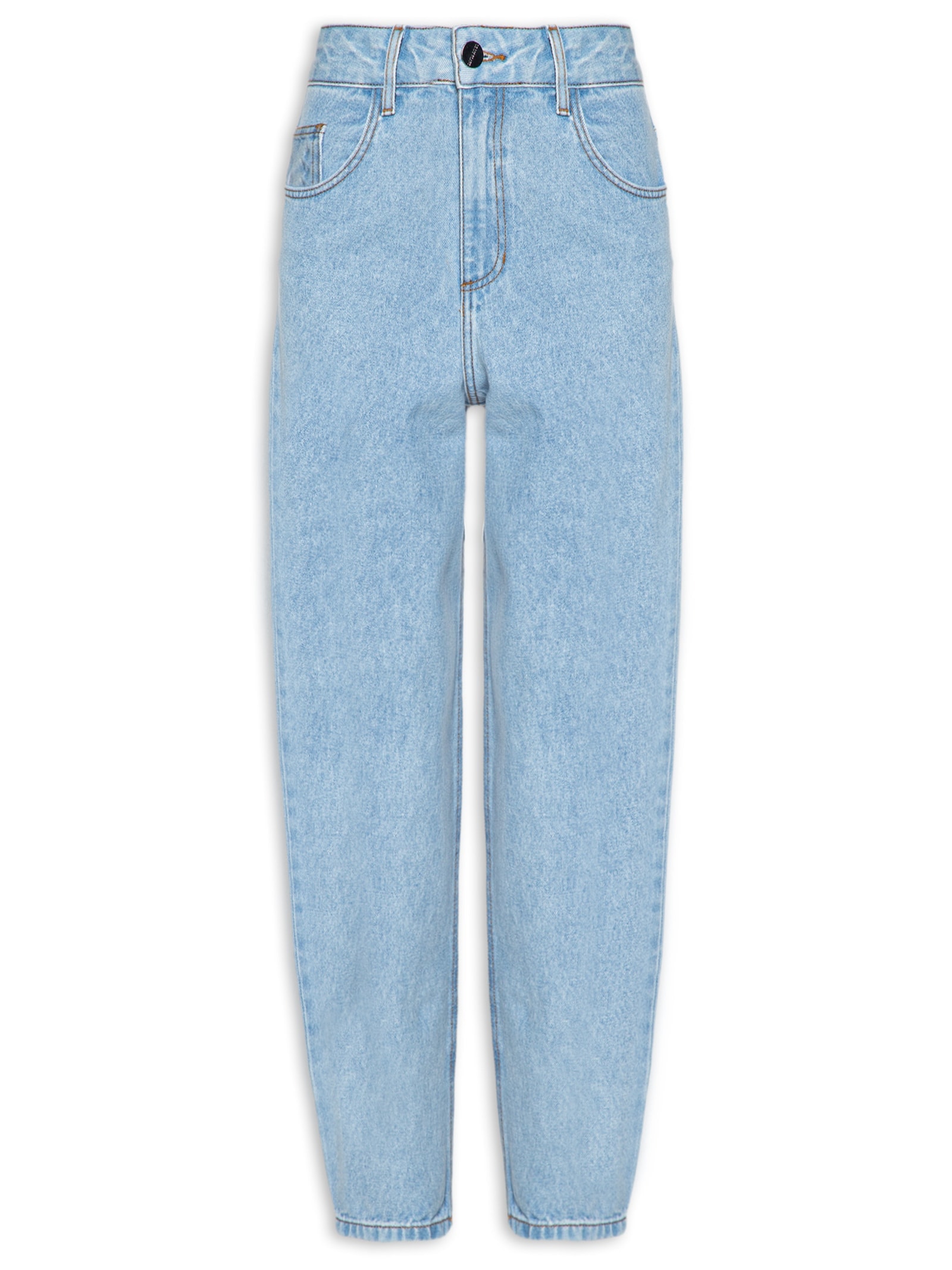 A calça azul é confeccionada em sarja com lavagem em jeans sem elasticidade. A peça solta ao corpo possui cintura alta, cós com passantes, recorte posterior, five pockets*, efeito estonado, comprimento cropped** e fechamento frontal por botão e zíper.