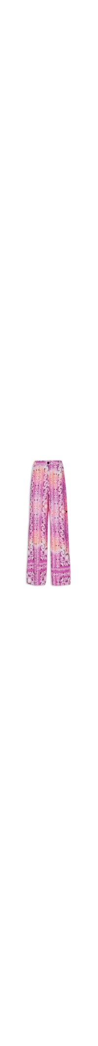 A calça rosa é confeccionada em tecido leve com toque de linho sem elasticidade. A peça solta ao corpo possui cintura alta, cós com elástico embutido, bolsos frontais modelo faca, bolsos posteriores, comprimento longo, mix de estampas em cores contrastantes e fechamento frontal por colchete e zíper.