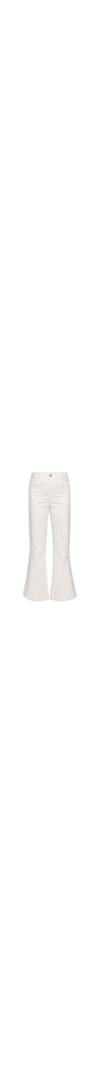 A calça bege é confeccionada em sarja com média elasticidade. A peça solta ao corpo possui cintura alta, cós com passantes, recorte posterior, five pockets*, comprimento cropped**, barras com acabamento em corte à fio, e fechamento frontal por botão e zíper.