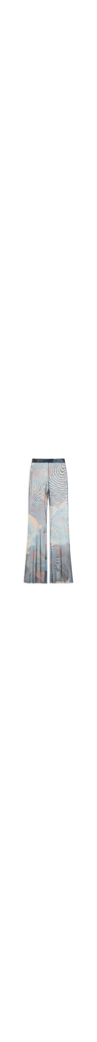 A calça azul é confeccionada em tule com alta elasticidade. A peça de modelo flare* possui cintura alta, cós elástico, transparência, estampa figurativa em cores contrastantes e comprimento longo.