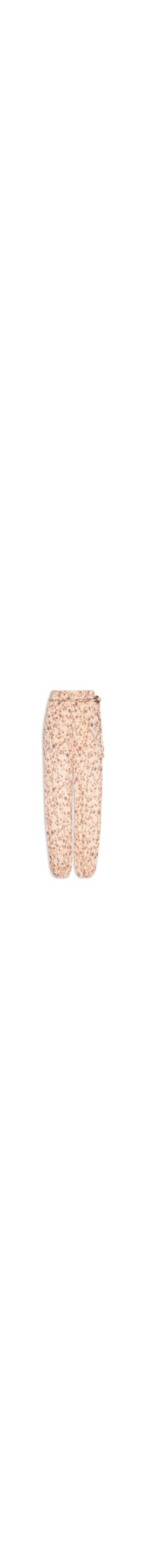 A calça bege é confeccionado em tecido leve sem elasticidade. A peça solta ao corpo possui cintura alta, cós com detalhe de cinto duplo com espessura fina e fivela metalizada aplicado, bolsos frontais embutidos, forro, elástico embutido na barra, comprimento longo e estampa floral em cores contrastantes.