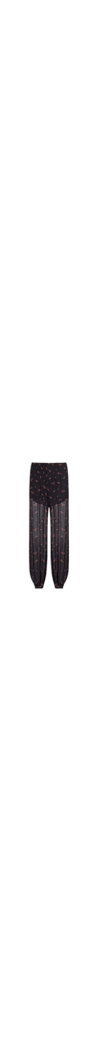 A calça preta é confeccionada em tecido leve sem elasticidade. A peça possui cintura média, cós com elástico embutido, modelagem solta, caimento fluido, comprimento longo e barras com acabamento em elástico, proporcionando efeito levemente ajustado no tornozelo, estampa em cor contrastante, transparência, forro e fechamento lateral por zíper invisível.