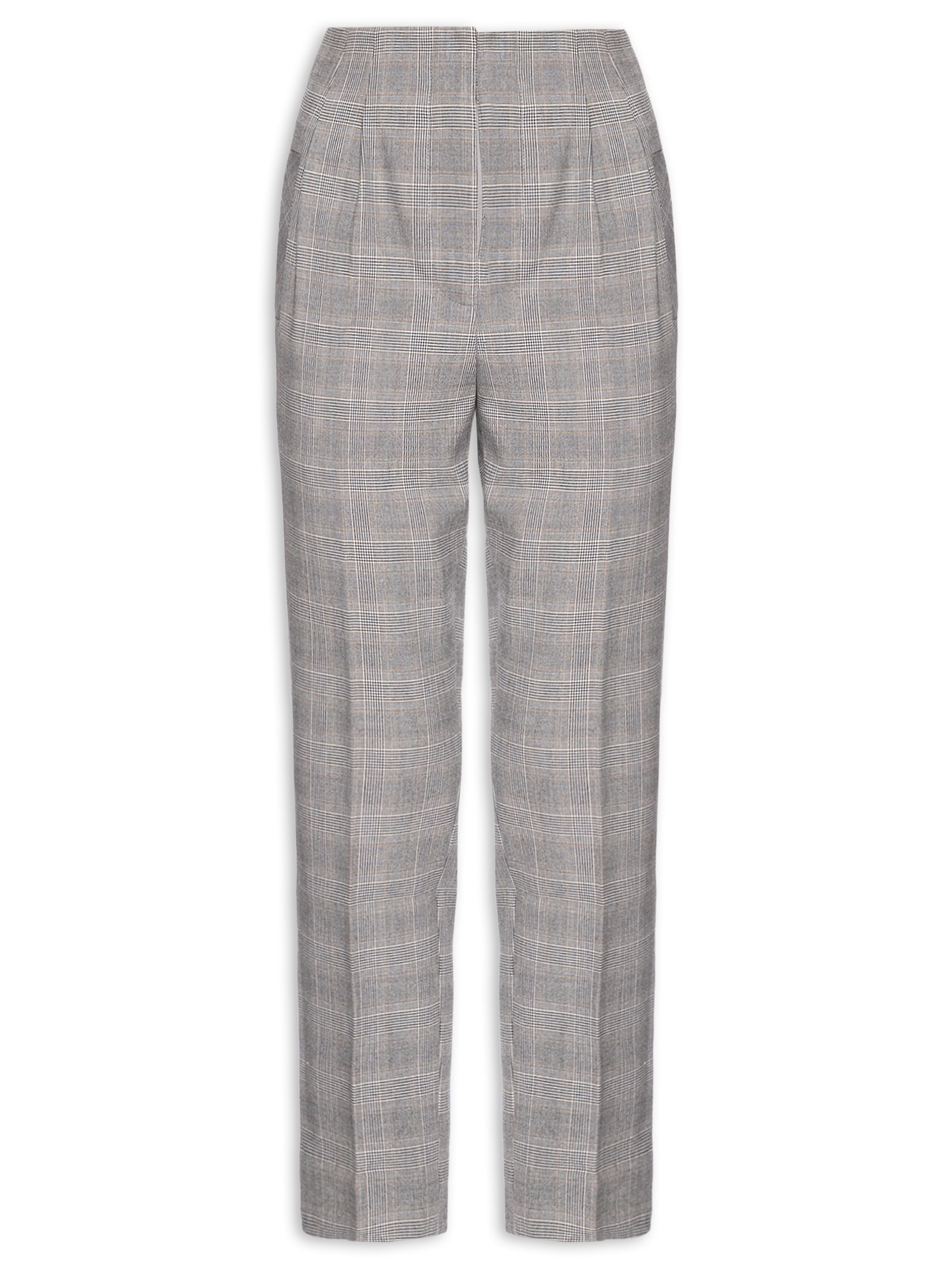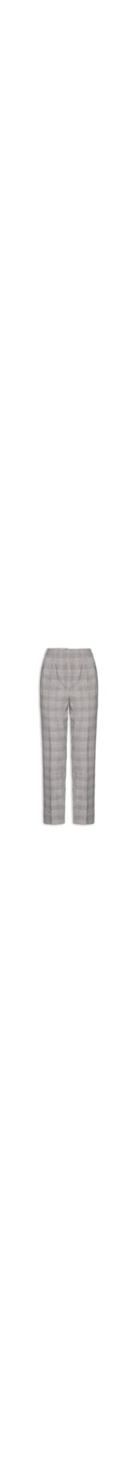 A calça cinza é confeccionado em tecido leve com baixa elasticidade. A peça solta ao corpo possui cintura alta, bolsos frontais e posteriores decorativos, tag da marca metalizada aplicada na parte posterior, padronagem xadrez em cores contrastantes, comprimento cropped* e fechamento frontal por colchetes e zíper.