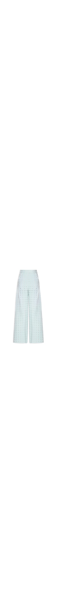 A calça Azul é Confeccionada Em laise Sem Elasticidade. A Peça Solta Ao Corpo Possui Cintura Alta, Botões Aplicados Na Lateral, Bolsos Laterais Modelo Faca, Recorte Frontal, Logo Da Marca Aplicado Em Metal Na Parte Posterior Na Altura Do Cós, Bolsos Posteriores, Padronagem Geométrica Bordada Na Cor Off White Com Detalhe De Aplicações Circulares Espelhadas, Comprimento Longo, Forro E Fechamento Lateral Por Botões Forrados.