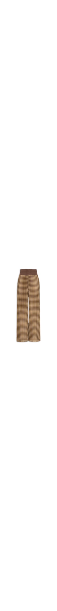 A calça marrom é confeccionada em tule de alta elasticidade. A peça solta ao corpo possui cintura alta, cós amplo com elástico embutido, bolsos frontais de modelo faca, padronagem xadrez em tons contrastantes, transparência, forro e comprimento longo.