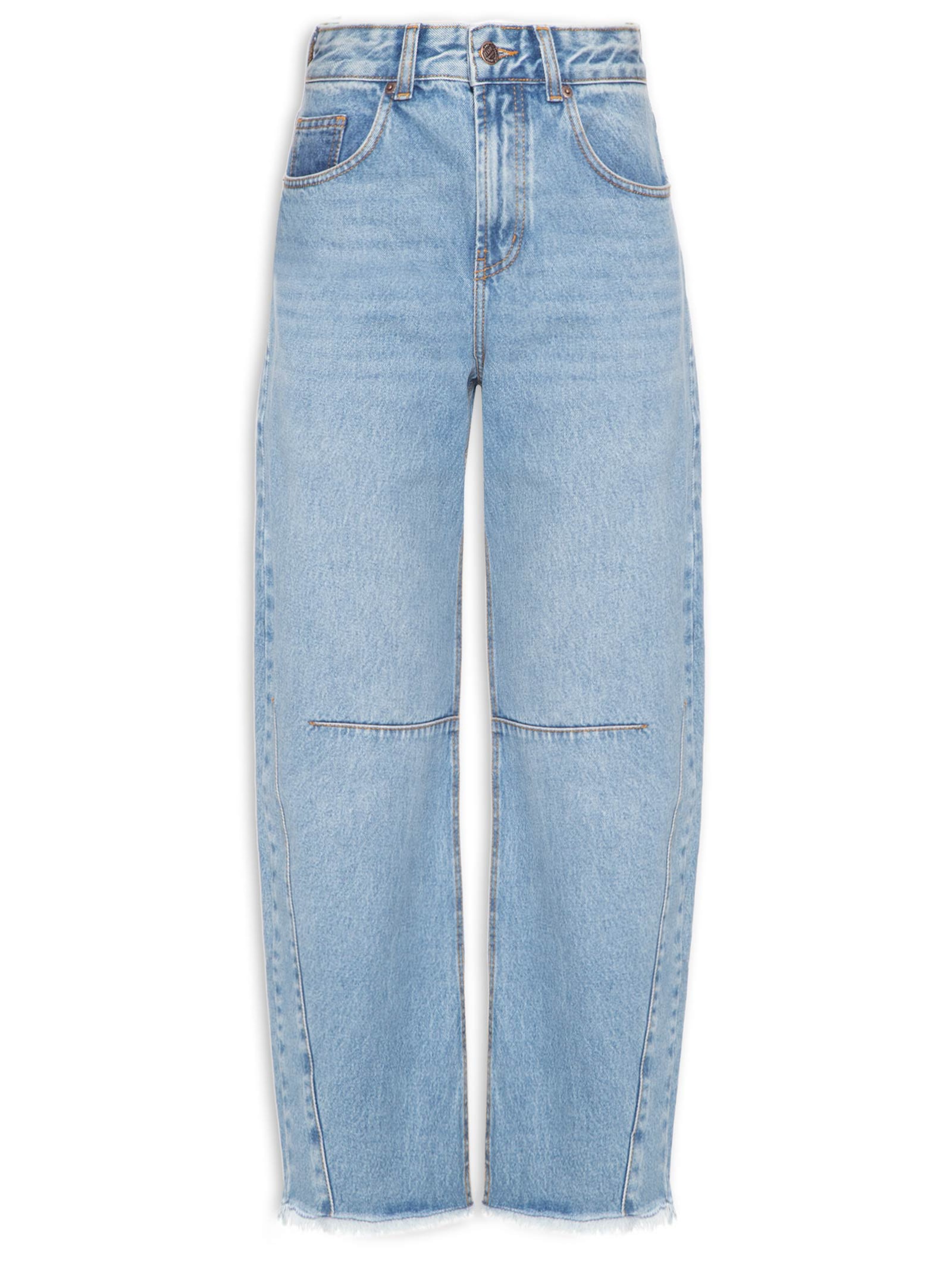 A calça azul é confeccionada em sarja com lavagem em jeans sem elasticidade. A peça solta ao corpo possui cintura alta, cós com passantes aplicados, recortes frontais e posteriores, five pockets*, tag da marca bordada no bolso posterior, barra desfiada, comprimento longo e fechamento frontal por botão e zíper.