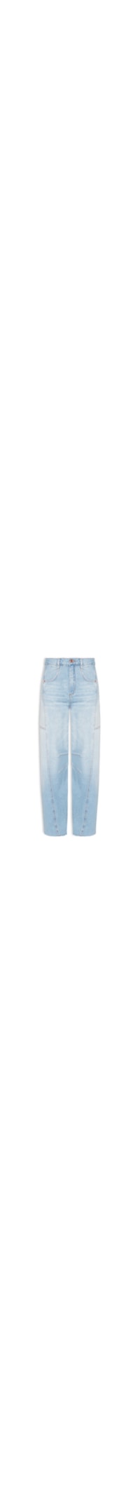A calça azul é confeccionada em sarja com lavagem jeans com baixa elasticidade. A peça de modelagem reta possui cós médio com passantes, bolsos frontais modelo faca com rebites metálicos, bolsos posteriores aplicados, recortes frontais e posteriores ao longo das pernas, comprimento longo, barra reta com acabamento a fio e fechamento frontal por zíper e botão metálico.
