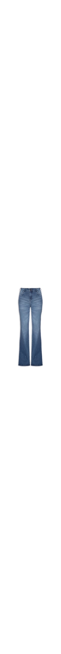 A calça azul é confeccionada em sarja com lavagem jeans com baixa elasticidade. A peça justa ao corpo possui cintura alta, cós com passantes para cinto, tag da marca aplicada na parte posterior do cós, five pockets*, efeito estonado, aplicação de strass na parte frontal, comprimento longo e fechamento frontal por zíper e botão.