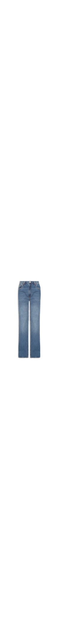 A calça azul é confeccionada em sarja com lavagem em jeans sem elasticidade. A peça solta ao corpo possui cintura alta, cós com passantes e tag da marca bordada na parte posterior, recorte posterior, five pockets* com rebites nos bolsos frontais, logo da marca aplicado em metal no bolso posterior, efeito estonado, puído nos bolsos e nas barras, comprimento longo e fechamento frontal por botão e zíper.
