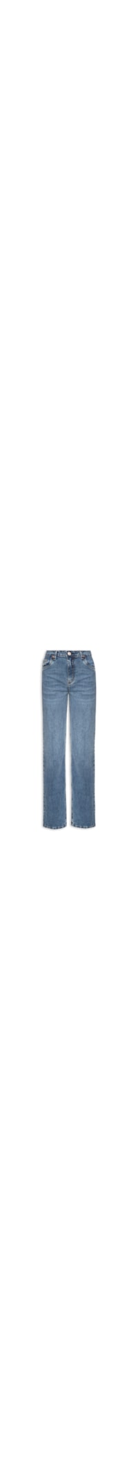 A calça azul é confeccionada em sarja com lavagem jeans sem elasticidade. A peça justa ao corpo possui cintura alta, cós com passantes, *five pockets, tag da marca aplicada em metal na parte posterior, efeito estonado, fechamento frontal por zíper e botão.