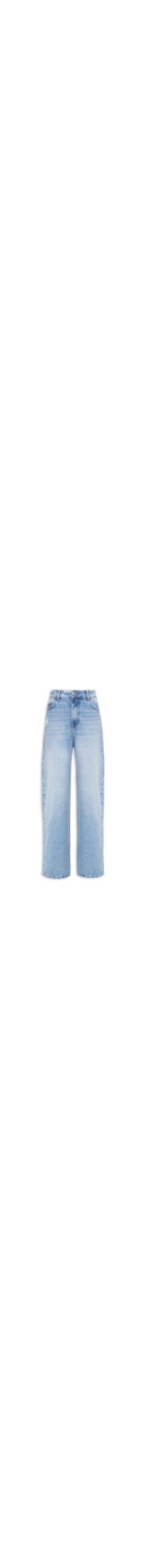 A calça azul é confeccionada em sarja com lavagem em jeans. A peça possui cintura alta, passantes aplicados no cós, five pockets*, detalhes destroyed* aplicados na parte frontal e posterior, tag da marca aplicada na parte posterior, detalhe de barra desfiada, shape solto, caimento reto, acabamento pespontado e fechamento frontal por zíper e botão.