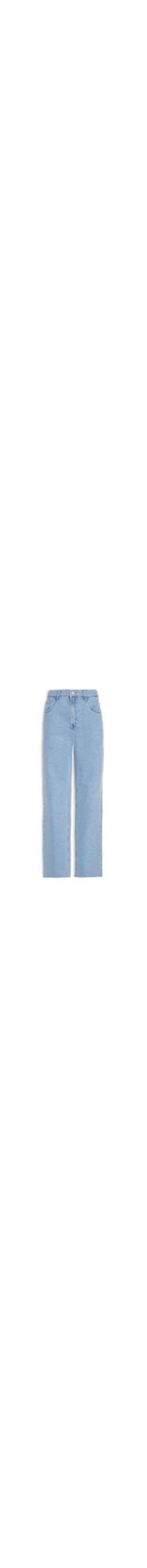 A calça azul é confeccionada em sarja com lavagem jeans. A peça possui cintura alta, cós com passantes aplicados e tag da marca em neon na parte posterior, five pockets* com rebites metalizados e neon, barra com acabamento corte à fio, comprimento longo, shape solto, caimento reto, acabamento pespontado de cor contrastante e fechamento frontal por botão e zíper.