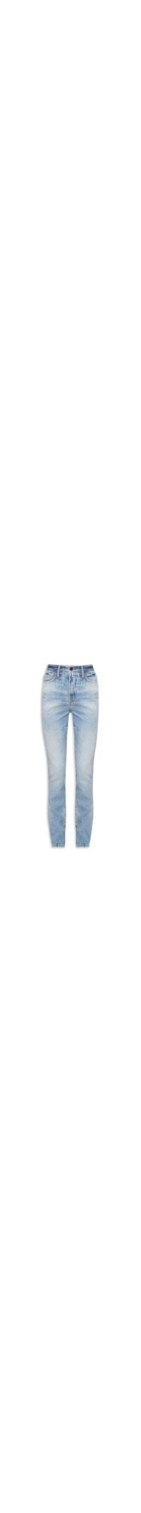 A calça azul é confeccionada em sarja com lavagem em jeans sem elasticidade. A peça solta ao corpo possui cintura alta, cós com passantes e tag da marca aplicada na parte posterior, recorte posterior, five pockets*, logo da marca aplicado em metal com cor contrastante no bolso posterior, detalhe de puído nas partes posterior e frontal, efeito estonado, comprimento longo e fechamento frontal por botão e zíper.