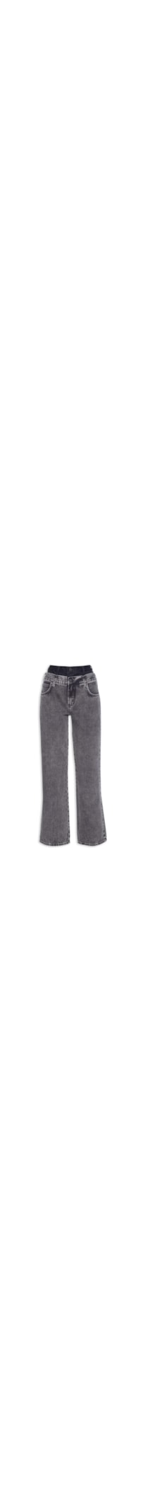 A calça preta é confeccionada em sarja sem elasticidade. A peça solta ao corpo possui cintura alta, cós duplo com passantes, tag da marca aplicada na parte posterior na altura do cós, recorte posterior, five pockets*, logo da marca aplicado em metal no bolso posterior com acabamento fosco, efeito estonado e fechamento frontal por botão e zíper.