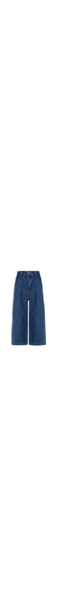 A calça azul é confeccionada em sarja com lavagem em jeans. A peça possui cintura alta, passantes aplicados, bolsos frontais com tarraxas aplicadas, bolsos posteriores, tag da marca aplicada na parte posterior, barra desfiada, comprimento cropped*, shape solto, caimento reto, acabamento pespontado e fechamento frontal por zíper e botão.