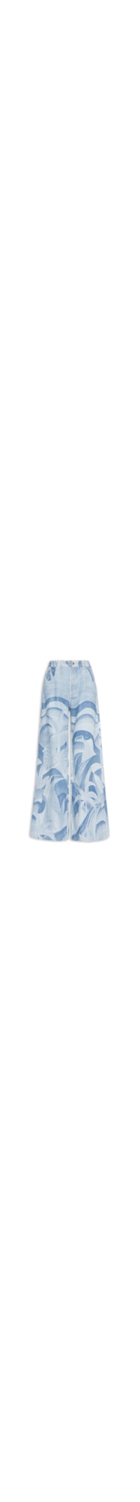 A calça jeans azul é confeccionada em sarja com lavagem jeans e sem elasticidade. A peça de modelo pantalona, possui cintura alta, cós com passantes aplicados, five pockets*, padronagem abstrata em cor contrastante, comprimento longo e fechamento frontal por zíper e botão.