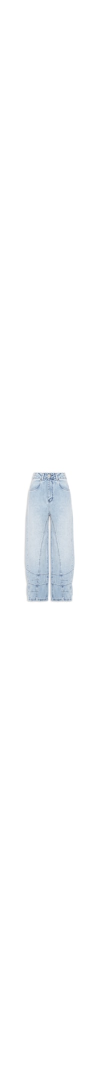 A calça azul é confeccionada em sarja com lavagem em jeans sem elasticidade. A peça solta ao corpo possui cintura alta, cós com passantes e tag da marca bordada na parte posterior, pences frontais e posteriores, five pockets*, detalhe de tag metalizada da marca no bolso posterior, recorte posterior e fechamento frontal por zíper e botão.
