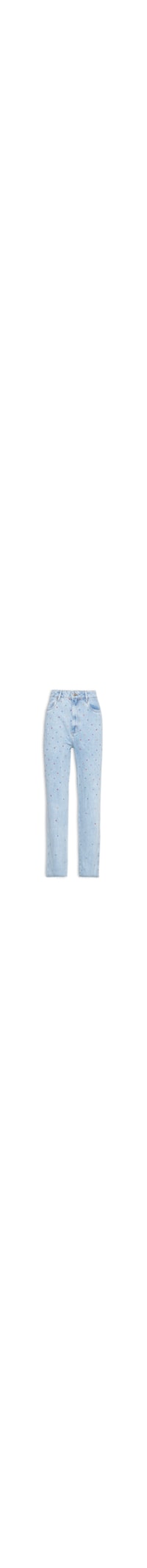 A calça azul é confeccionada em sarja com lavagem jeans sem elasticidade. A peça solta ao corpo de modelo reto possui cintura média, cós com passantes aplicados, *five pockets, tag da marca aplicada em metal na parte posterior, detalhes pespontados em cor contrastante, pedrarias em cores contrastantes aplicadas na parte frontal, comprimento longo, barra com acabamento desfiado, e fechamento frontal por zíper e botão.