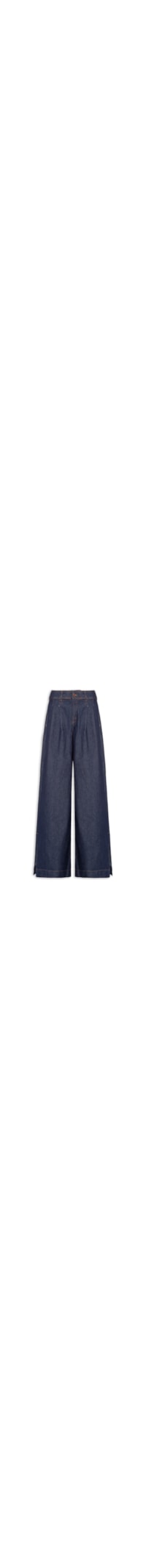 A calça azul é confeccionada em sarja com lavagem jeans sem elasticidade. A peça solta ao corpo possui cintura alta, cós com passantes, dois bolsos posteriores, recortes frontais e posteriores, barra ampla com fendas, comprimento longo e fechamento frontal por botão e zíper.