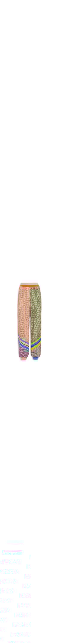 A calça laranja é confeccionada em tecido leve. A peça modelo jogger* possui cintura alta, cós elástico canelado e com padronagem listrada, mix de estampas em cores contrastantes, barra elástica canelada e com padronagem listrada, comprimento longo e shape solto.