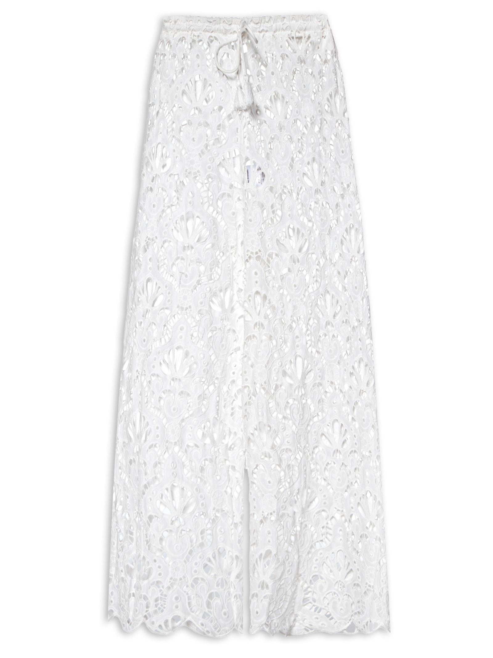 A calça branca é confeccionada em laise sem elasticidade. A peça solta ao corpo possui cintura alta, elástico embutido no cós com cordão para amarração, padronagem em conchas com recortes vazados, transparência e comprimento longo.