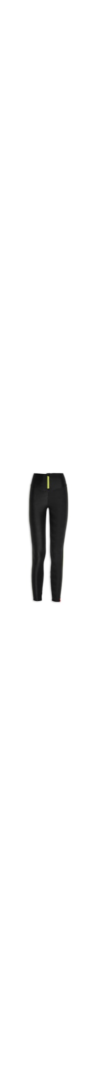 A calça preta é confeccionada em malha com superfície texturizada. A peça de modelo legging* possui cintura alta, cós anatômico, detalhe de zíper em neon aplicado na parte frontal do cós e bolso na parte posterior, recortes laterais em malha cirrê com aplicação de viés em cor contrastante, tag da marca com superfície emborrachada e cor contrastante aplicada na barra esquerda, comprimento longo, shape justo, caimento reto e acabamento pespontado.