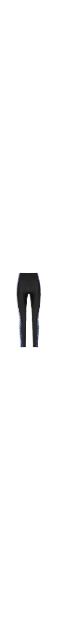 A calça preta é confeccionada em malha cirrê com alta elasticidade. A peça justa ao corpo de modelo legging* possui cintura alta, cós anatômico, recortes laterais em malha em cores contrastantes, tag da marca de tom contrastante aplicada na altura da barra e comprimento longo.
