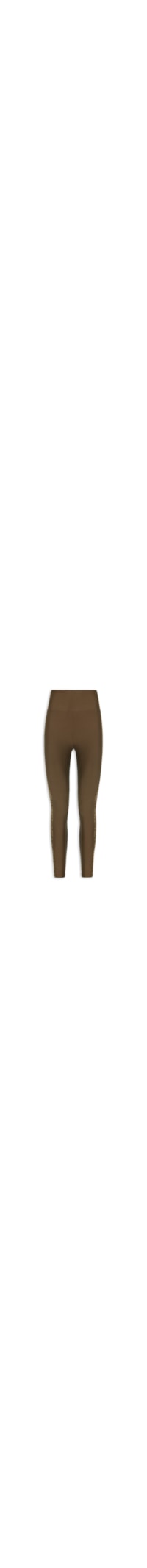 A calça marrom é confeccionada em malha de poliamida com média elasticidade. A peça justa ao corpo possui cintura alta, cós amplo, bolso embutido no cós posterior com aba sobreposta, nome da marca aplicado nas laterais e comprimento longo.