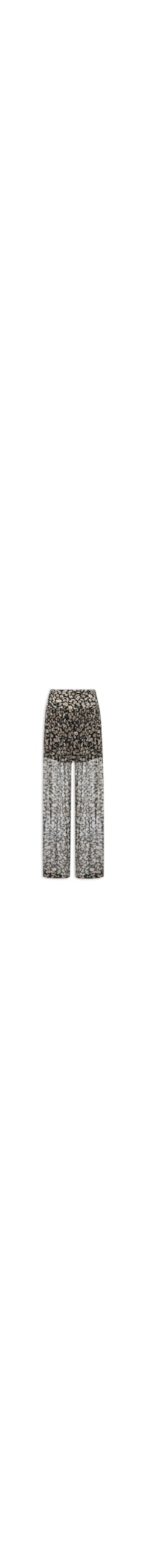 A calça preta é confeccionada em tecido leve sem elasticidade. A peça solta ao corpo possui cintura alta, cós amplo com efeito drapeado, pregas frontais e posteriores na altura do quadril, estampa floral em cores contrastantes, transparência, forro, comprimento longo e fechamento lateral por zíper invisível.