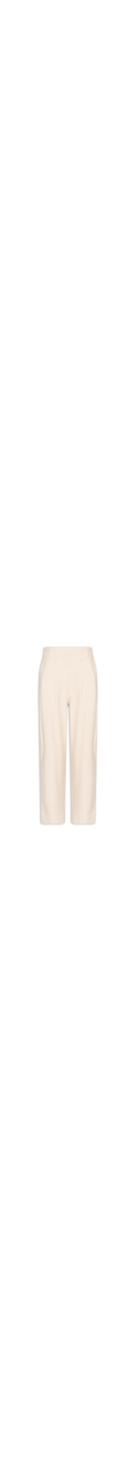 A calça bege é confeccionada em tecido leve com toque de linho sem elasticidade. A peça solta ao corpo modelo cenoura possui cintura alta, cós com passantes e elástico embutido na parte posterior com detalhe franzido, bolsos frontais embutidos, bolsos posteriores, detalhe de botões na lateral, pregas frontais e comprimento longo.