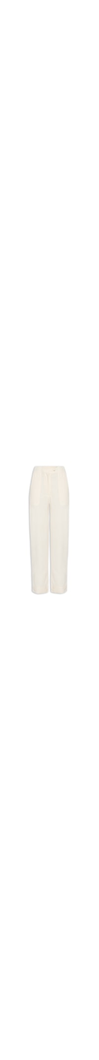 A calça bege é confeccionada por linho sem elasticidade. A peça solta ao corpo possui cintura alta, elástico embutido no cós, bolsos frontais no modelo faca, bolos posteriores, fechamento por botão e zíper frontal e comprimento cropped*.